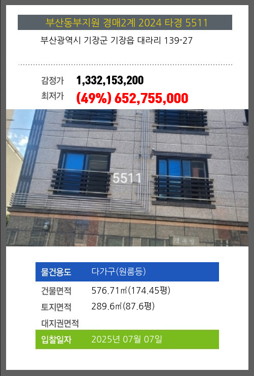 사건번호 2024 타경 5511 본건은 부산광역시 기장군 기장읍 대라리 139-27소재하는 다가구(원룸등)경매 물건의 포스팅입니다. 건물면적 [ 576.71㎡ (174.45평) ]토지면적 [ 289.6㎡ (87.6평) ] 시세를 반영한 감정가