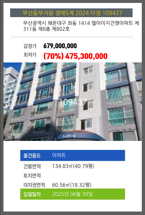 사건번호 2024 타경 109437 본건은 부산광역시 해운대구 좌동 1414 엘아이지건영아파트 제311동 제8층 제802호소재하는 아파트경매 물건의 포스팅입니다. 건물면적 [ 134.83㎡ (40.79평) ]대지권 [ 60.56㎡ (18.32평) ]