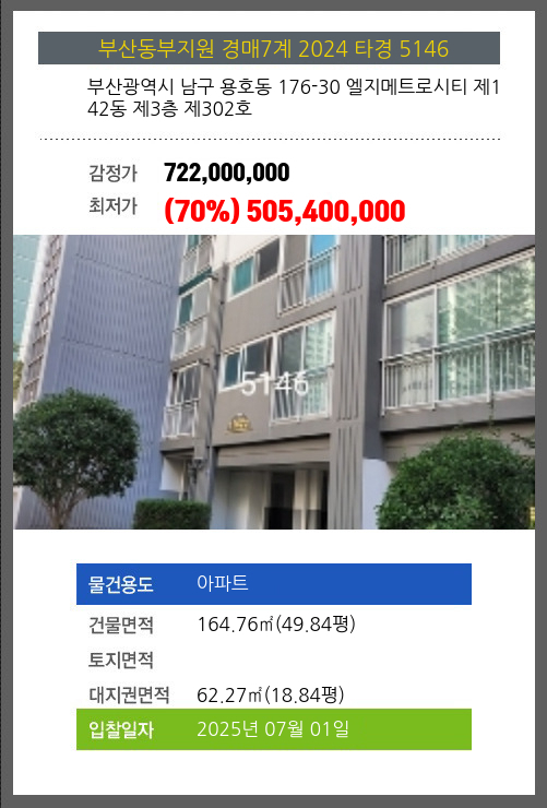 사건번호 2024 타경 5146 본건은 부산광역시 남구 용호동 176-30 엘지메트로시티 제142동 제3층 제302호소재하는 아파트경매 물건의 포스팅입니다. 건물면적 [ 164.76㎡ (49.84평) ]대지권 [ 62.27㎡ (18.84평) ]
