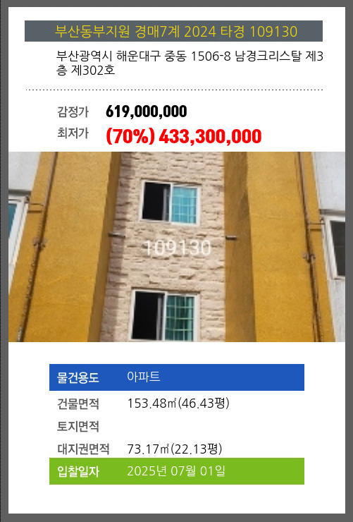 사건번호 2024 타경 109130 본건은 부산광역시 해운대구 중동 1506-8 남경크리스탈 제3층 제302호소재하는 아파트경매 물건의 포스팅입니다. 건물면적 [ 153.48㎡ (46.43평) ]대지권 [ 73.17㎡ (22.13평) ] 시세를