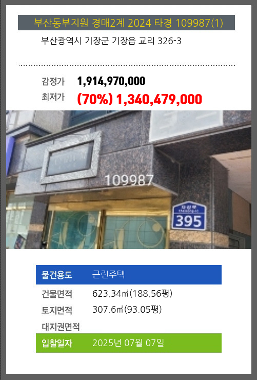 사건번호 2024 타경 109987(1) 본건은 부산광역시 기장군 기장읍 교리 326-3소재하는 근린주택경매 물건의 포스팅입니다. 건물면적 [ 623.34㎡ (188.56평) ]토지면적 [ 307.6㎡ (93.05평) ] 시세를 반영한 감정가