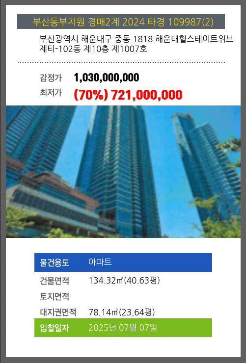 사건번호 2024 타경 109987(2) 본건은 부산광역시 해운대구 중동 1818 해운대힐스테이트위브 제티-102동 제10층 제1007호소재하는 아파트경매 물건의 포스팅입니다. 건물면적 [ 134.32㎡ (40.63평) ]대지권 [ 78.14㎡ (23.64평) ]