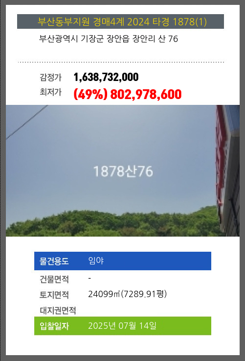 사건번호 2024 타경 1878(1) 본건은 부산광역시 기장군 장안읍 장안리 산 76소재하는 임야경매 물건의 포스팅입니다. 토지면적 [ 24099㎡ (7289.91평) ] 시세를 반영한 감정가 1,638,732,000에서2회 유찰되어 감정가