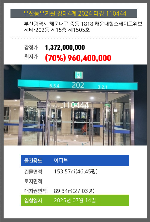 사건번호 2024 타경 110444 본건은 부산광역시 해운대구 중동 1818 해운대힐스테이트위브 제티-202동 제15층 제1505호소재하는 아파트경매 물건의 포스팅입니다. 건물면적 [ 153.57㎡ (46.45평) ]대지권 [ 89.34㎡ (27.03평) ]