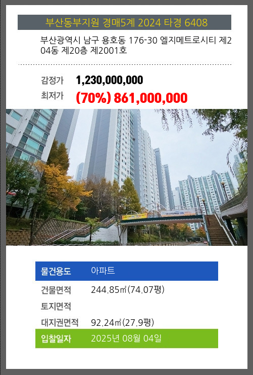 사건번호 2024 타경 6408 본건은 부산광역시 남구 용호동 176-30 엘지메트로시티 제204동 제20층 제2001호소재하는 아파트경매 물건의 포스팅입니다. 건물면적 [ 244.85㎡ (74.07평) ]대지권 [ 92.24㎡ (27.9평) ]