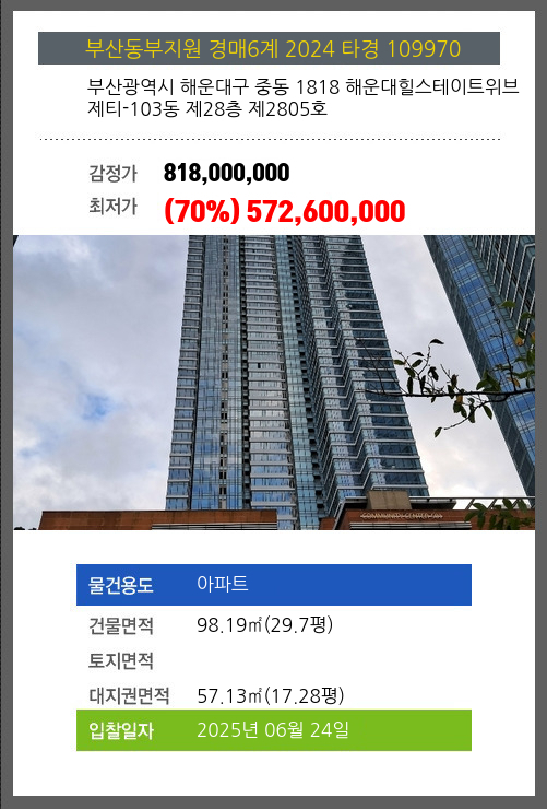 사건번호 2024 타경 109970 본건은 부산광역시 해운대구 중동 1818 해운대힐스테이트위브 제티-103동 제28층 제2805호소재하는 아파트경매 물건의 포스팅입니다. 건물면적 [ 98.19㎡ (29.7평) ]대지권 [ 57.13㎡ (17.28평) ]
