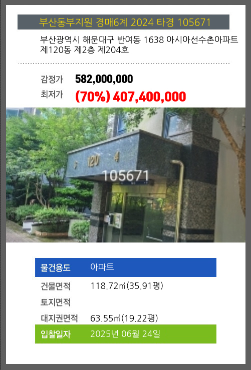 사건번호 2024 타경 105671 본건은 부산광역시 해운대구 반여동 1638 아시아선수촌아파트 제120동 제2층 제204호소재하는 아파트경매 물건의 포스팅입니다. 건물면적 [ 118.72㎡ (35.91평) ]대지권 [ 63.55㎡ (19.22평) ]