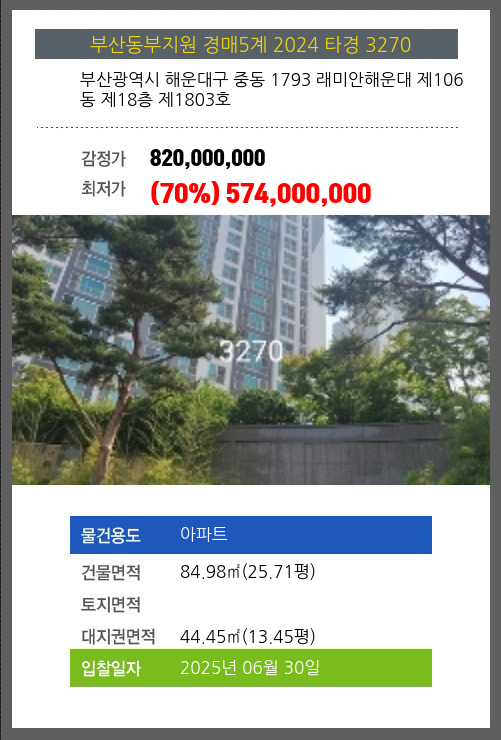 사건번호 2024 타경 3270 본건은 부산광역시 해운대구 중동 1793 래미안해운대 제106동 제18층 제1803호소재하는 아파트경매 물건의 포스팅입니다. 건물면적 [ 84.98㎡ (25.71평) ]대지권 [ 44.45㎡ (13.45평) ]