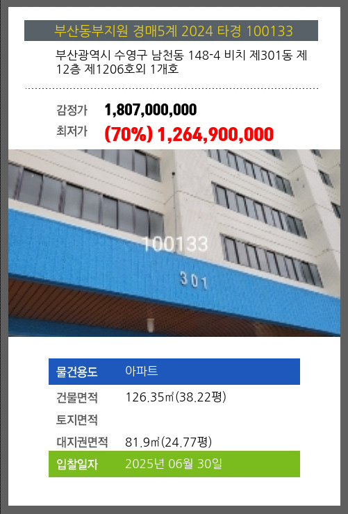 사건번호 2024 타경 100133 본건은 부산광역시 수영구 남천동 148-4 비치 제301동 제12층 제1206호외 1개호소재하는 아파트경매 물건의 포스팅입니다. 건물면적 [ 126.35㎡ (38.22평) ]대지권 [ 81.9㎡ (24.77평)