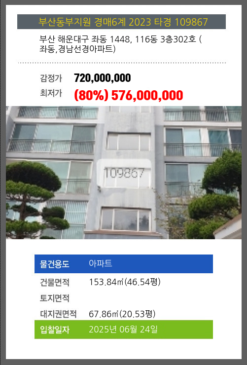 사건번호 2023 타경 109867 본건은 부산 해운대구 좌동 1448, 116동 3층302호 (좌동,경남선경아파트)소재하는 아파트경매 물건의 포스팅입니다. 건물면적 [ 153.84㎡ (46.54평) ]대지권 [ 67.86㎡ (20.53평) ] 시세를