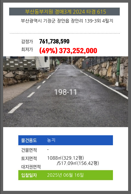 사건번호 2024 타경 615 본건은 부산광역시 기장군 장안읍 장안리 139-3외 4필지소재하는 농지경매 물건의 포스팅입니다. 토지면적 [ 전체:1088㎡ (329.12평) 매각지분:517.09㎡ (156.42평) ] 시세를 반영한 감정가 761,738,590에서3회