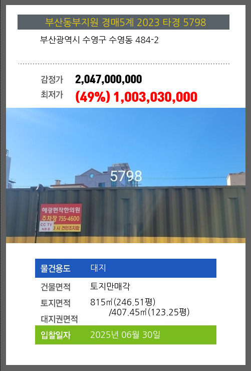 사건번호 2023 타경 5798 본건은 부산광역시 수영구 수영동 484-2소재하는 대지경매 물건의 포스팅입니다. 건물면적 [ 토지만매각 ]토지면적 [ 전체:815㎡ (246.51평) 매각지분:407.45㎡ (123.25평) ] 시세를 반영한 감정가