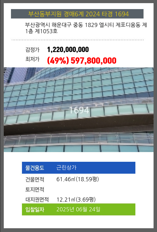 사건번호 2024 타경 1694 본건은 부산광역시 해운대구 중동 1829 엘시티 제포디움동 제1층 제1053호소재하는 근린상가경매 물건의 포스팅입니다. 건물면적 [ 61.46㎡ (18.59평) ]대지권 [ 12.21㎡ (3.69평) ]