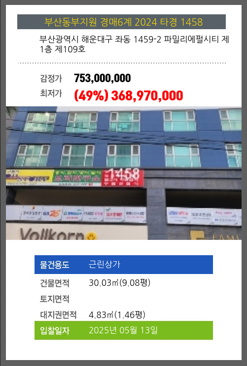 사건번호 2024 타경 1458 본건은 부산광역시 해운대구 좌동 1459-2 파밀리에펄시티 제1층 제109호소재하는 근린상가경매 물건의 포스팅입니다. 건물면적 [ 30.03㎡ (9.08평) ]대지권 [ 4.83㎡ (1.46평) ] 시세를