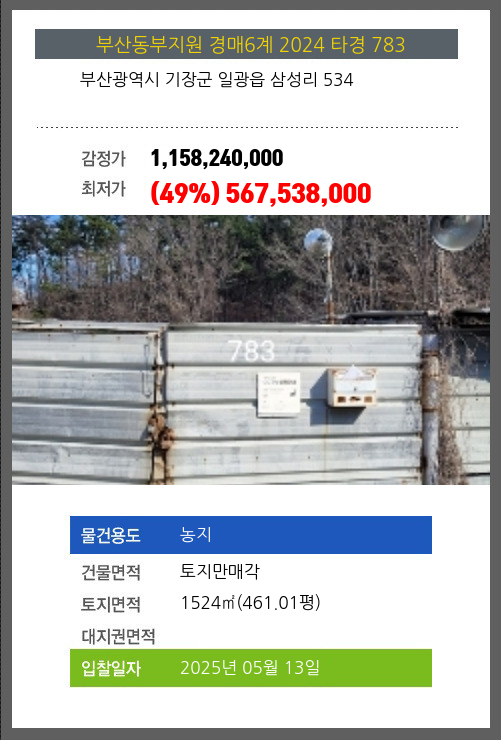 사건번호 2024 타경 783 본건은 부산광역시 기장군 일광읍 삼성리 534소재하는 농지경매 물건의 포스팅입니다. 건물면적 [ 토지만매각 ]토지면적 [ 1524㎡ (461.01평) ] 시세를 반영한 감정가 1,158,240,000에서2회