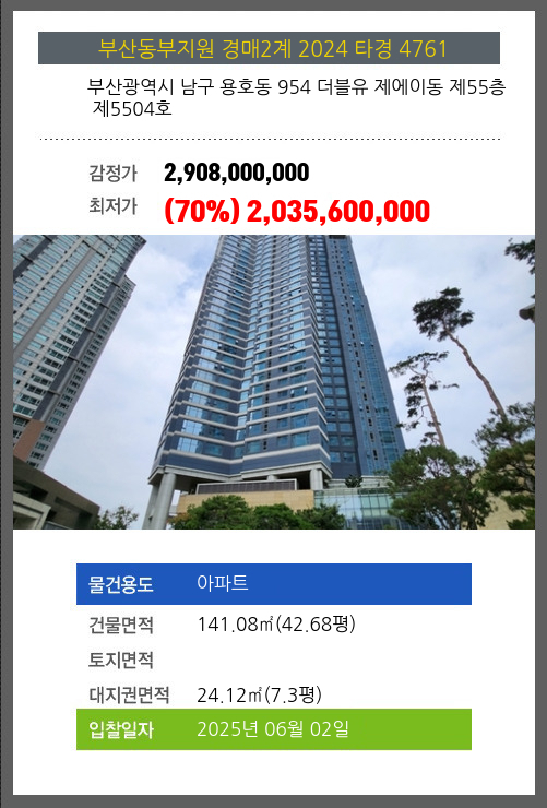 사건번호 2024 타경 4761 본건은 부산광역시 남구 용호동 954 더블유 제에이동 제55층 제5504호소재하는 아파트경매 물건의 포스팅입니다. 건물면적 [ 141.08㎡ (42.68평) ]대지권 [ 24.12㎡ (7.3평) ]