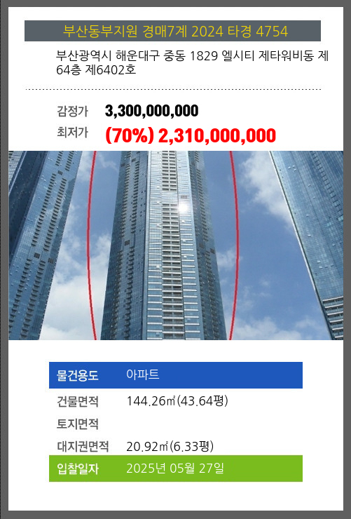 사건번호 2024 타경 4754 본건은 부산광역시 해운대구 중동 1829 엘시티 제타워비동 제64층 제6402호소재하는 아파트경매 물건의 포스팅입니다. 건물면적 [ 144.26㎡ (43.64평) ]대지권 [ 20.92㎡ (6.33평) ]