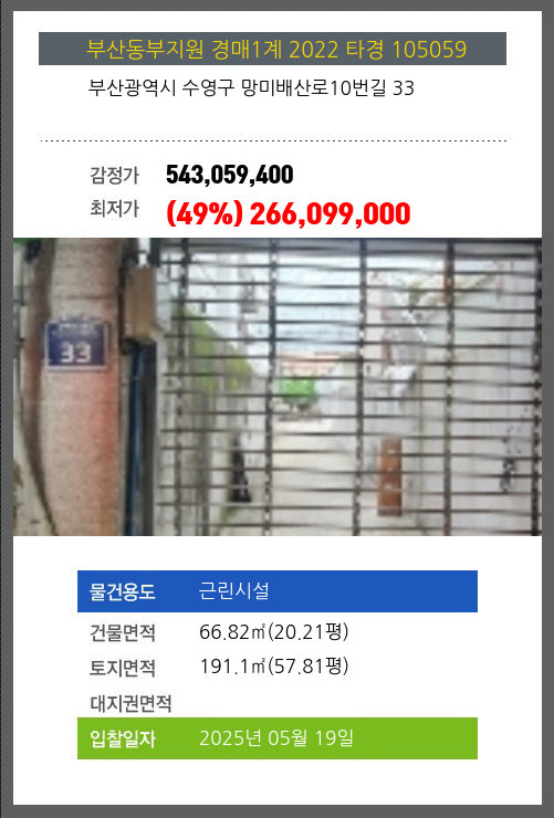 사건번호 2022 타경 105059 본건은 부산광역시 수영구 망미배산로10번길 33소재하는 근린시설경매 물건의 포스팅입니다. 건물면적 [ 66.82㎡ (20.21평) ]토지면적 [ 191.1㎡ (57.81평) ] 시세를 반영한 감정가 543,059,400에서2회