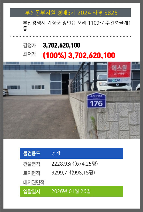 사건번호 2024 타경 5825 본건은 부산광역시 기장군 장안읍 오리 1109-7 주건축물제1동소재하는 공장경매 물건의 포스팅입니다. 건물면적 [ 2228.93㎡ (674.25평) ]토지면적 [ 3299.7㎡ (998.15평) ] 시세를 반영한