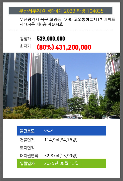 사건번호 2023 타경 104035 본건은 부산광역시 북구 화명동 2290 코오롱하늘채1차아파트 제109동 제6층 제604호소재하는 아파트경매 물건의 포스팅입니다. 건물면적 [ 114.9㎡ (34.76평) ]대지권 [ 52.87㎡ (15.99평) ]