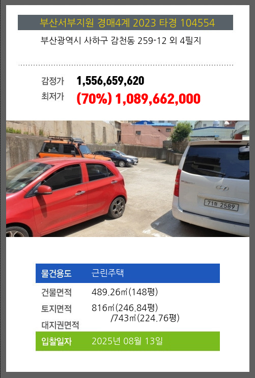 사건번호 2023 타경 104554 본건은 부산광역시 사하구 감천동 259-12 외 4필지소재하는 근린주택경매 물건의 포스팅입니다. 건물면적 [ 489.26㎡ (148평) ]토지면적 [ 전체:816㎡ (246.84평) 매각지분:743㎡ (224.76평) ]