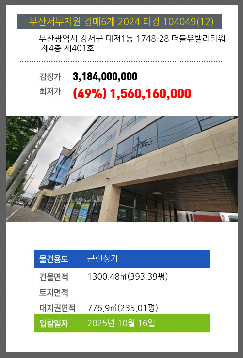 사건번호 2024 타경 104049(12) 본건은 부산광역시 강서구 대저1동 1748-28 더블유밸리타워 제4층 제401호소재하는 근린상가경매 물건의 포스팅입니다. 건물면적 [ 1300.48㎡ (393.39평) ]대지권 [ 776.9㎡ (235.01평) ] 시세를
