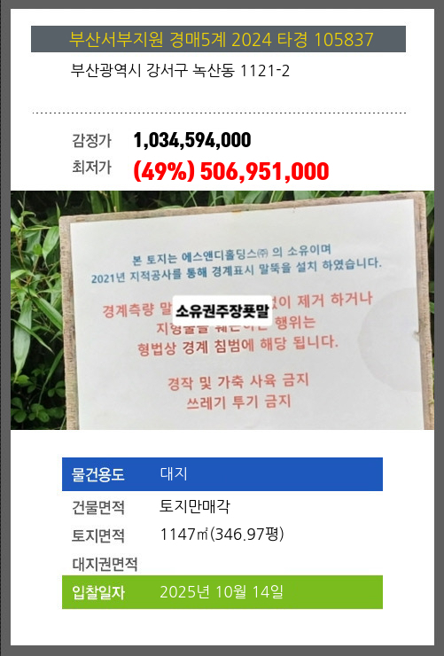 사건번호 2024 타경 105837 본건은 부산광역시 강서구 녹산동 1121-2소재하는 대지경매 물건의 포스팅입니다. 건물면적 [ 토지만매각 ]토지면적 [ 1147㎡ (346.97평) ] 시세를 반영한 감정가 1,034,594,000에서2회 유찰되어