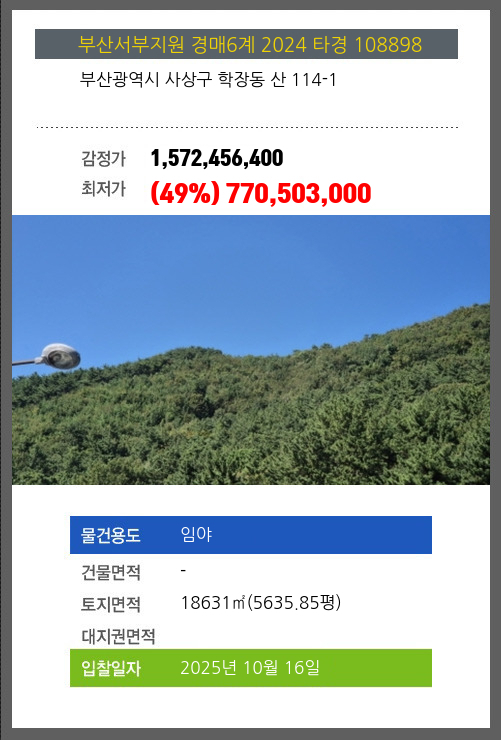 사건번호 2024 타경 108898 본건은 부산광역시 사상구 학장동 산 114-1소재하는 임야경매 물건의 포스팅입니다. 토지면적 [ 18631㎡ (5635.85평) ] 시세를 반영한 감정가 1,572,456,400에서2회 유찰되어 감정가 대비