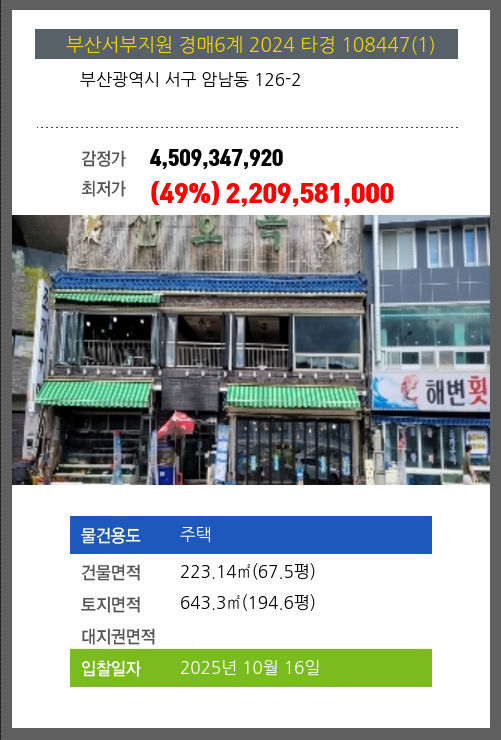 사건번호 2024 타경 108447(1) 본건은 부산광역시 서구 암남동 126-2소재하는 주택경매 물건의 포스팅입니다. 건물면적 [ 223.14㎡ (67.5평) ]토지면적 [ 643.3㎡ (194.6평) ] 시세를 반영한 감정가 4,509,347,920에서2회