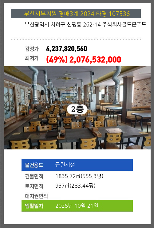 사건번호 2024 타경 107536 본건은 부산광역시 사하구 신평동 262-14 주식회사골드문푸드소재하는 근린시설경매 물건의 포스팅입니다. 건물면적 [ 1835.72㎡ (555.3평) ]토지면적 [ 937㎡ (283.44평) ] 시세를 반영한 감정가