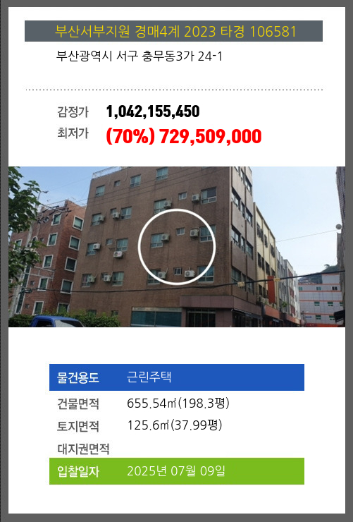 사건번호 2023 타경 106581 본건은 부산광역시 서구 충무동3가 24-1소재하는 근린주택경매 물건의 포스팅입니다. 건물면적 [ 655.54㎡ (198.3평) ]토지면적 [ 125.6㎡ (37.99평) ] 시세를 반영한 감정가 1,042,155,450에서1회