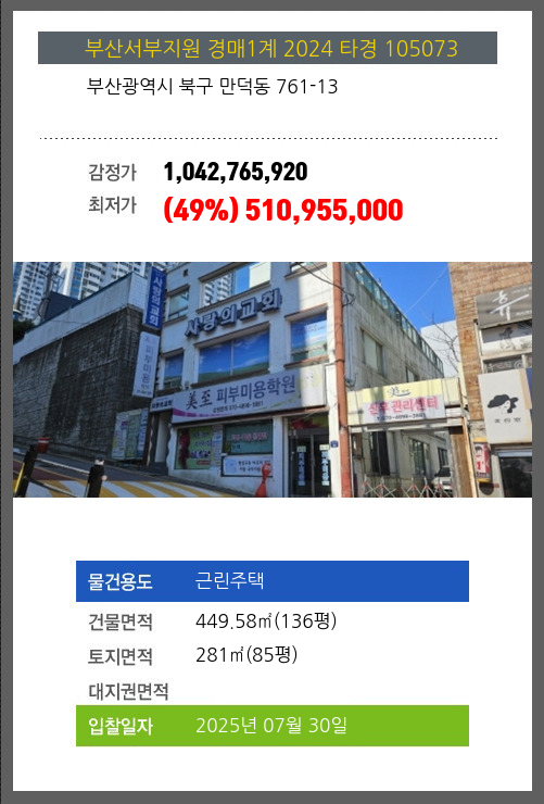 사건번호 2024 타경 105073 본건은 부산광역시 북구 만덕동 761-13소재하는 근린주택경매 물건의 포스팅입니다. 건물면적 [ 449.58㎡ (136평) ]토지면적 [ 281㎡ (85평) ] 시세를 반영한 감정가 1,042,765,920에서2회