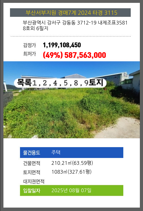사건번호 2024 타경 3115 본건은 부산광역시 강서구 강동동 3712-19 내제조표35818호외 6필지소재하는 주택경매 물건의 포스팅입니다. 건물면적 [ 210.21㎡ (63.59평) ]토지면적 [ 1083㎡ (327.61평) ] 시세를 반영한