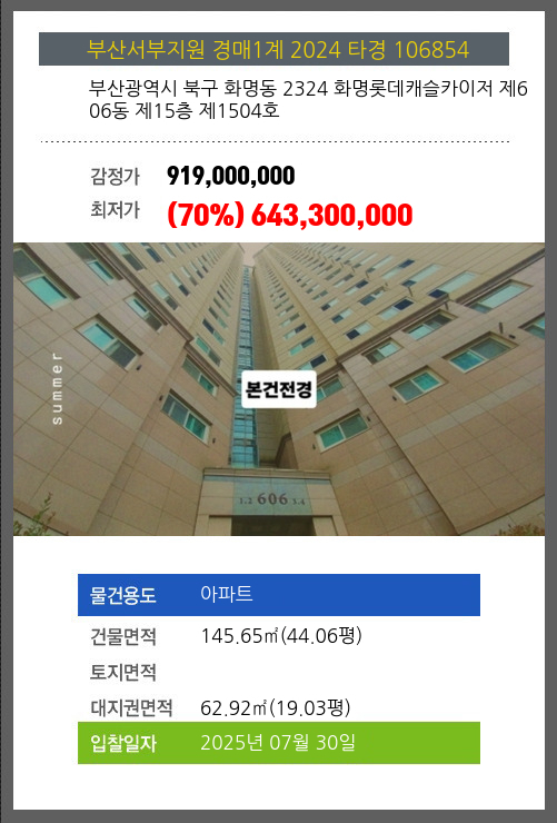 사건번호 2024 타경 106854 본건은 부산광역시 북구 화명동 2324 화명롯데캐슬카이저 제606동 제15층 제1504호소재하는 아파트경매 물건의 포스팅입니다. 건물면적 [ 145.65㎡ (44.06평) ]대지권 [ 62.92㎡ (19.03평) ]