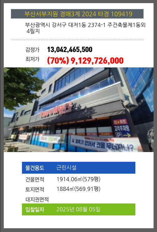 사건번호 2024 타경 109419 본건은 부산광역시 강서구 대저1동 2374-1 주건축물제1동외 4필지소재하는 근린시설경매 물건의 포스팅입니다. 건물면적 [ 1914.06㎡ (579평) ]토지면적 [ 1884㎡ (569.91평) ] 시세를 반영한