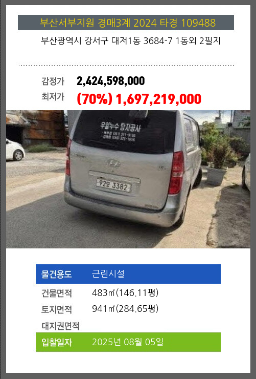 사건번호 2024 타경 109488 본건은 부산광역시 강서구 대저1동 3684-7 1동외 2필지소재하는 근린시설경매 물건의 포스팅입니다. 건물면적 [ 483㎡ (146.11평) ]토지면적 [ 941㎡ (284.65평) ] 시세를 반영한