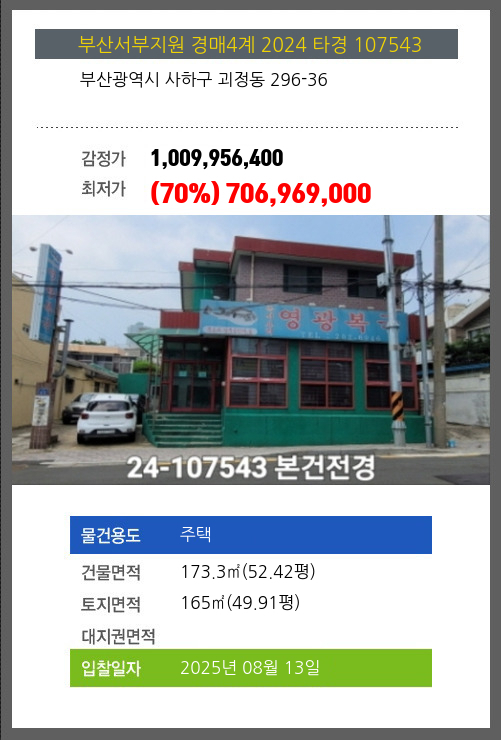 사건번호 2024 타경 107543 본건은 부산광역시 사하구 괴정동 296-36소재하는 주택경매 물건의 포스팅입니다. 건물면적 [ 173.3㎡ (52.42평) ]토지면적 [ 165㎡ (49.91평) ] 시세를 반영한 감정가 1,009,956,400에서1회