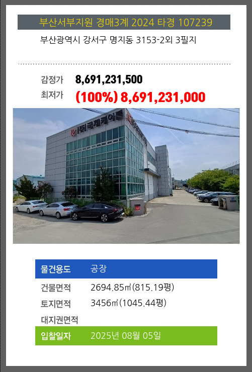사건번호 2024 타경 107239 본건은 부산광역시 강서구 명지동 3153-2외 3필지소재하는 공장경매 물건의 포스팅입니다. 건물면적 [ 2694.85㎡ (815.19평) ]토지면적 [ 3456㎡ (1045.44평) ] 시세를 반영한 감정가