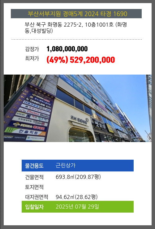 사건번호 2024 타경 1690 본건은 부산 북구 화명동 2275-2, 10층1001호 (화명동,대성빌딩)소재하는 근린상가경매 물건의 포스팅입니다. 건물면적 [ 693.8㎡ (209.87평) ]대지권 [ 94.62㎡ (28.62평) ] 시세를 반영한