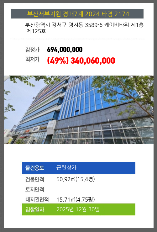 사건번호 2024 타경 2174 본건은 부산광역시 강서구 명지동 3589-6 케이비타워 제1층 제125호소재하는 근린상가경매 물건의 포스팅입니다. 건물면적 [ 50.92㎡ (15.4평) ]대지권 [ 15.71㎡ (4.75평) ] 시세를