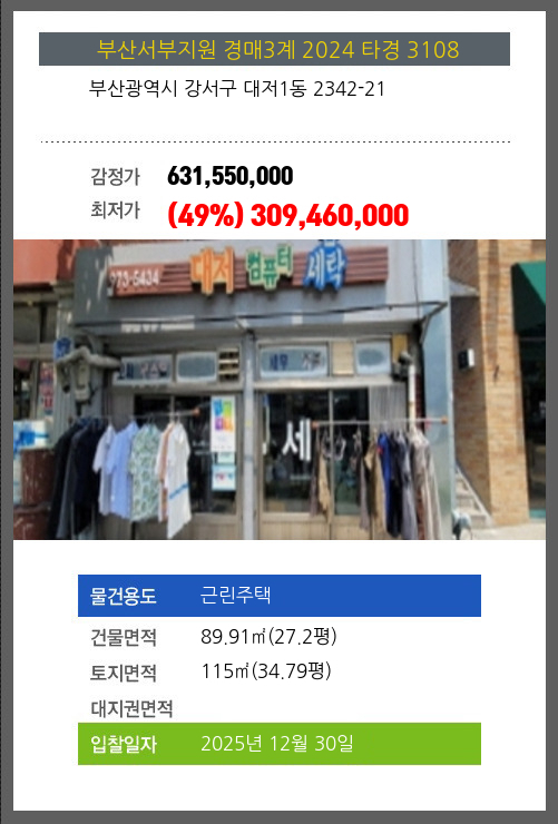 사건번호 2024 타경 3108 본건은 부산광역시 강서구 대저1동 2342-21소재하는 근린주택경매 물건의 포스팅입니다. 건물면적 [ 89.91㎡ (27.2평) ]토지면적 [ 115㎡ (34.79평) ] 시세를 반영한 감정가 631,550,000에서2회
