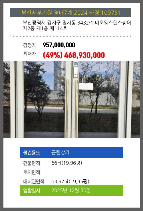 사건번호 2024 타경 109761 본건은 부산광역시 강서구 명지동 3432-1 네오웨스턴스퀘어 제2동 제1층 제114호소재하는 근린상가경매 물건의 포스팅입니다. 건물면적 [ 66㎡ (19.96평) ]대지권 [ 63.97㎡ (19.35평) ]