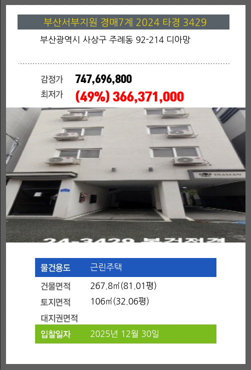 사건번호 2024 타경 3429 본건은 부산광역시 사상구 주례동 92-214 디아망소재하는 근린주택경매 물건의 포스팅입니다. 건물면적 [ 267.8㎡ (81.01평) ]토지면적 [ 106㎡ (32.06평) ] 시세를 반영한 감정가