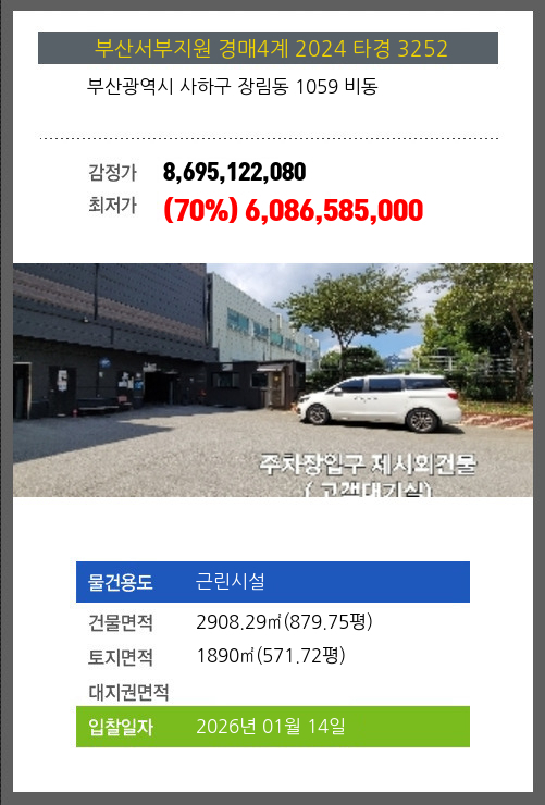 사건번호 2024 타경 3252 본건은 부산광역시 사하구 장림동 1059 비동소재하는 근린시설경매 물건의 포스팅입니다. 건물면적 [ 2908.29㎡ (879.75평) ]토지면적 [ 1890㎡ (571.72평) ] 시세를 반영한 감정가