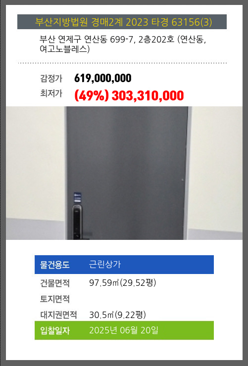 사건번호 2023 타경 63156(3) 본건은 부산 연제구 연산동 699-7, 2층202호 (연산동,여고노블레스)소재하는 근린상가경매 물건의 포스팅입니다. 건물면적 [ 97.59㎡ (29.52평) ]대지권 [ 30.5㎡ (9.22평) ] 시세를 반영한