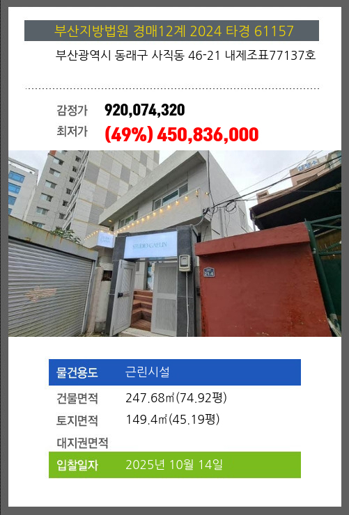 사건번호 2024 타경 61157 본건은 부산광역시 동래구 사직동 46-21 내제조표77137호소재하는 근린시설경매 물건의 포스팅입니다. 건물면적 [ 247.68㎡ (74.92평) ]토지면적 [ 149.4㎡ (45.19평) ] 시세를 반영한 감정가