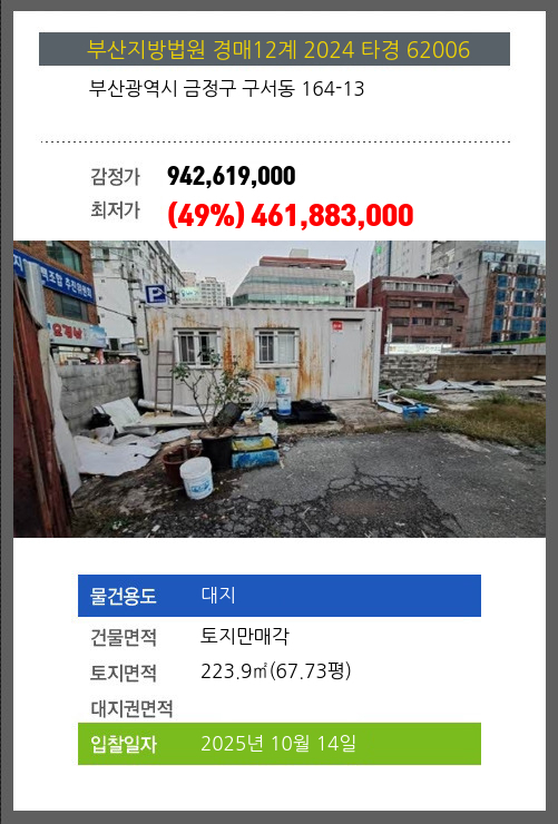 사건번호 2024 타경 62006 본건은 부산광역시 금정구 구서동 164-13소재하는 대지경매 물건의 포스팅입니다. 건물면적 [ 토지만매각 ]토지면적 [ 223.9㎡ (67.73평) ] 시세를 반영한 감정가 942,619,000에서2회 유찰되어