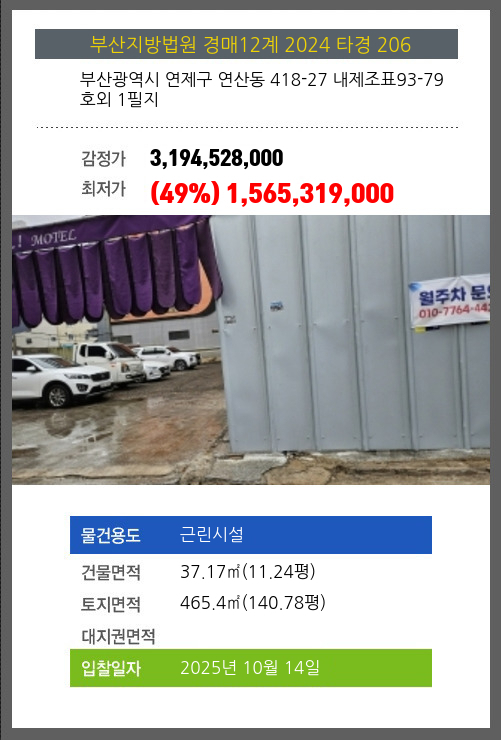 사건번호 2024 타경 206 본건은 부산광역시 연제구 연산동 418-27 내제조표93-79호외 1필지소재하는 근린시설경매 물건의 포스팅입니다. 건물면적 [ 37.17㎡ (11.24평) ]토지면적 [ 465.4㎡ (140.78평) ] 시세를 반영한
