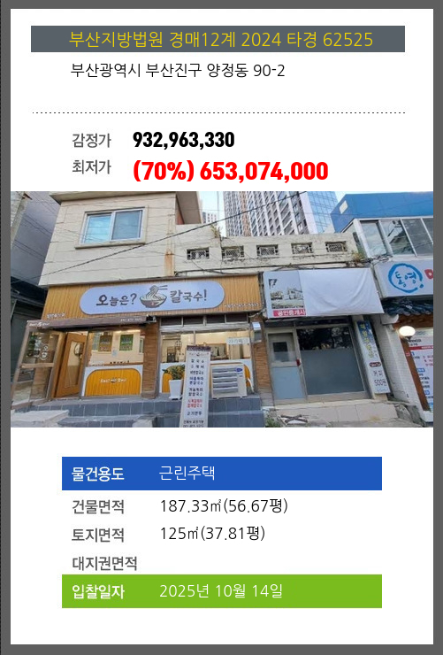 사건번호 2024 타경 62525 본건은 부산광역시 부산진구 양정동 90-2소재하는 근린주택경매 물건의 포스팅입니다. 건물면적 [ 187.33㎡ (56.67평) ]토지면적 [ 125㎡ (37.81평) ] 시세를 반영한 감정가 932,963,330에서1회