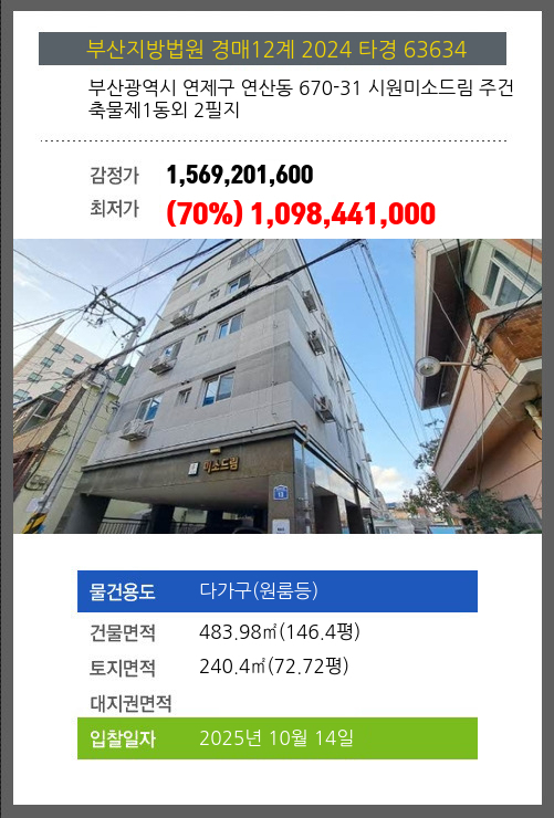 사건번호 2024 타경 63634 본건은 부산광역시 연제구 연산동 670-31 시원미소드림 주건축물제1동외 2필지소재하는 다가구(원룸등)경매 물건의 포스팅입니다. 건물면적 [ 483.98㎡ (146.4평) ]토지면적 [ 240.4㎡ (72.72평) ] 시세를